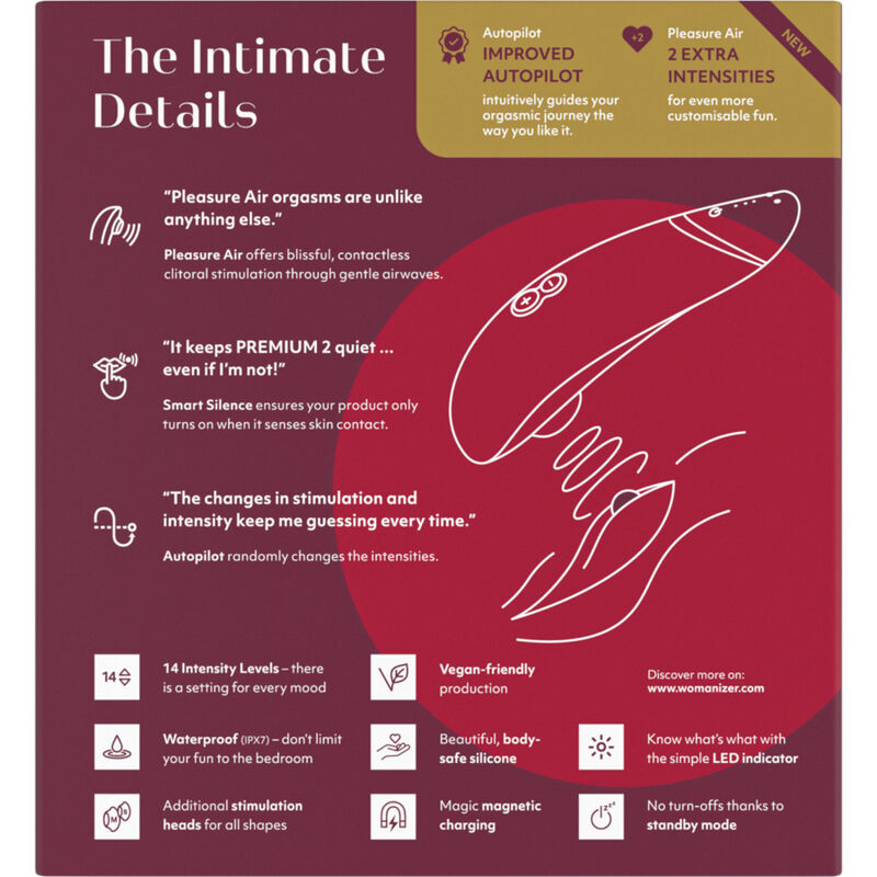 Il Womanizer Premium 2 ha amplificato il suo gioco con più livelli di intensità che mai e una funzione di pilota automatico migliorata per accompagnarti nella corsa della tua vita. Con l’originale tecnologia Pleasure Air, questo è il giocattolo definitivo per le donne che cercano qualcosa di più di un semplice dispositivo con cui giocare.
